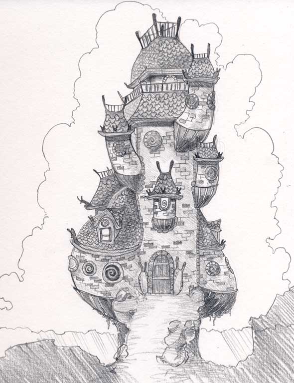 I have always adored creepy houses. Not fairy tale houses with frilly pinks and shiny windows. The dark, tall, daunting kingdoms of doom where the bad guys live. I realize that no matter how much I like that, when I draw them, it is still with a smile. It isn’t really creepy. But, I had a lot of fun making this piece. I guess my bad guys will always be like Duke Igthorn.