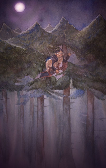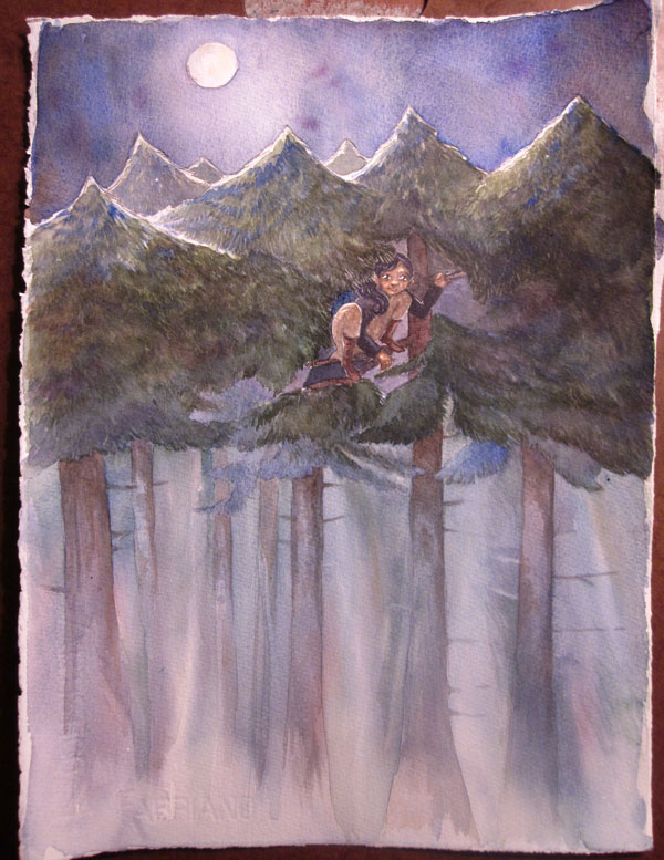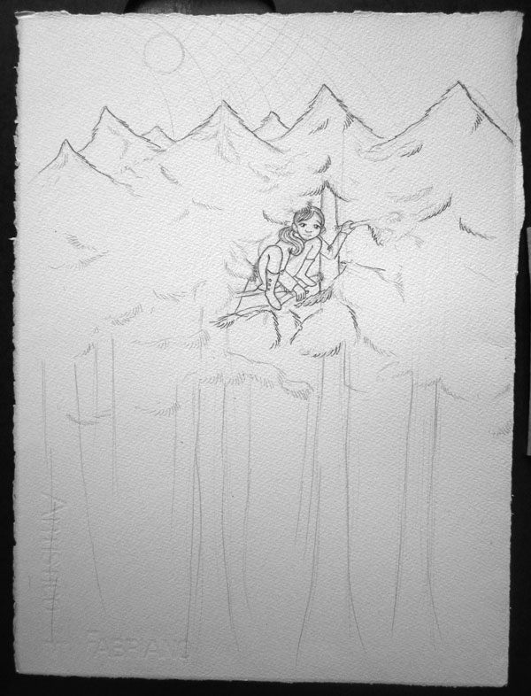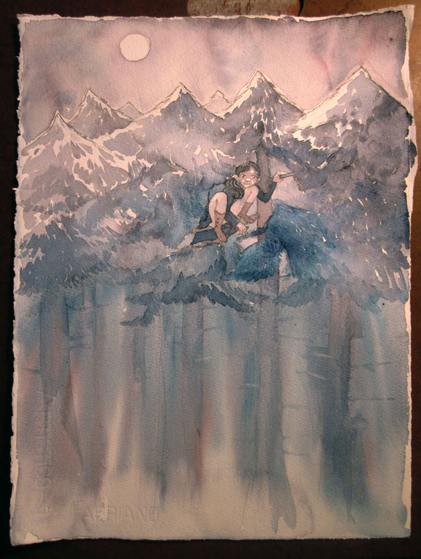 What kind of reference were you working from? Did you want to go cartoony, realistic, or somewhere in between? It’s leaning cartoony right now, because of her facial proportions and the simplistic tree shapes, but that may be what you wanted. In either case I think it’s working best in the initial watercolor wash stage, so maybe you just overworked it. Even though you added more color and detail in the later stages, the forms were clearer and more natural before that, and I like how she stood out in just a few clean flat tones before you added more shading. Perhaps you could try working back into your scan of that earlier stage to just work out the values and colors a little bit, and call that your new finish?
