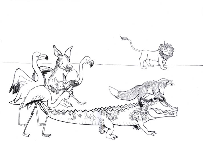 Monochromatic – 5 Posted bycaseygDecember 27, 2011Posted in2012Tags:b&w, crocodile, flamingo, fox, kangaroo, line work, lion, mouse, sketchbook project 2012 Quote Quiz:”He’s got you for poisoning him, and me for roping him, and you for acting like he was first prize at a turkey shoot!” Currently Reading:Polar Express by Chris Van Allsburg Like Loading... Related