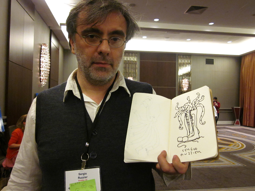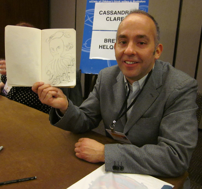 After the panel and wonderful final keynote by Kathryn Erskine it was autograph party time. My search for more Octo-Puss in Boots continued. I failed to bring my book with me but, after a smart suggestion from a friend I realized I should use my current sketchbook. I could secure the pages into the real book with photo corners. They are now safe and sound in the tome.