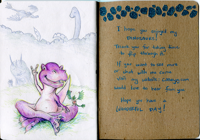 “Criss Cross Apple Sauce!” A T Rex sitting cross legged. That was a mind twister to draw. Bringing the book to a close I wanted to have a few of the dinos from the book give one last look to the read.