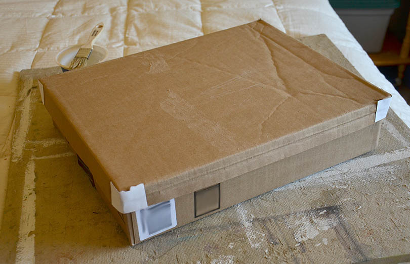 If all looks good I apply my thin layer glue, allow it to dry for a minute, then line the top over the paper and press it onto the paper. I then lift paper and lid and smooth out the paper around the lid with my hands. I apply more glue to any parts that need extra with either my brush or paper.