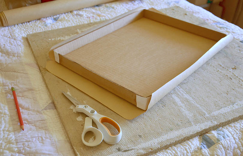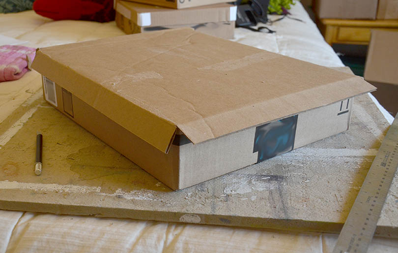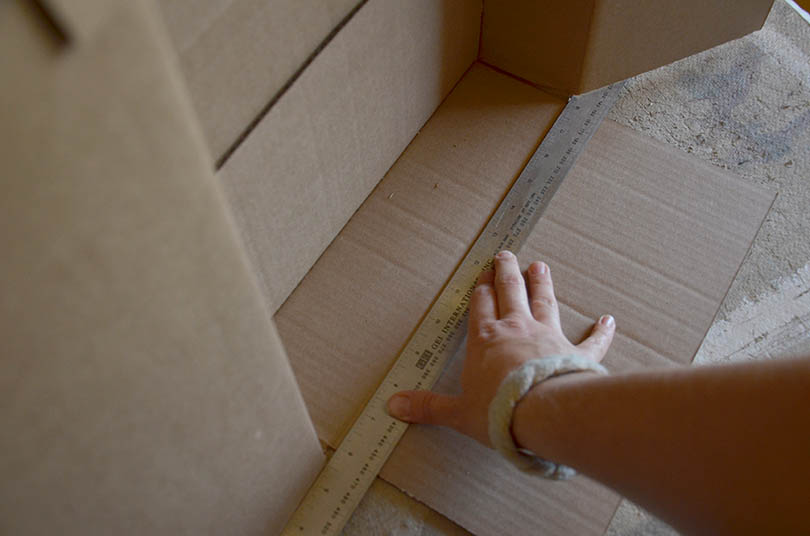 Then I have a box! Now I lay this box on top of the piece of cardboard I intend to use as a lid. If possible I use the already existing creases for the sides. I measure out from each crease or edge line, if there aren’t enough creases, 1 1/4 inches for the sides.