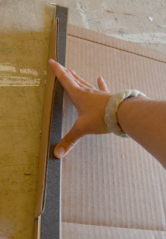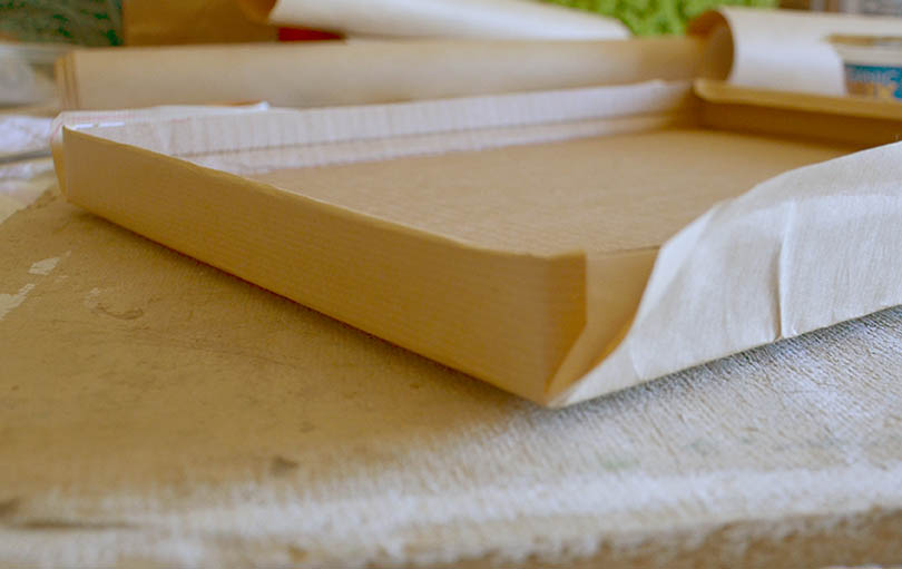 I then brush on a thin layer of glue over each side covering. After a minute of dry time I press the base onto the paper and then pick up the base and rub the paper onto the base with my hands. This flattens out any bubbles or ridges. Usually I have to add a little more glue to the edges of the covering to get it to lay flat. I do this with either my brush or a piece of paper. I paint the corner of a piece of card stock and slide it under the side covering, between it and the base, to give it a layer of glue. Then I press the side covering down to adhere it to the base.
