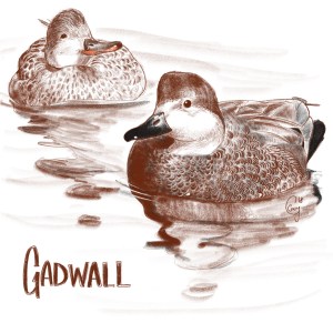 Gadwalls, the understated duck. They may not flash bright colors but, when you take a closer look they are beautifully patterned ducks. The lines across their feathers are vermiculated, they kind of look like they are wearing tweed. To spot Gadwalls in the groups of ducks look for a what you may think is a female duck but, is darker in tone. Their heads are also more rounded than most other ducks.
