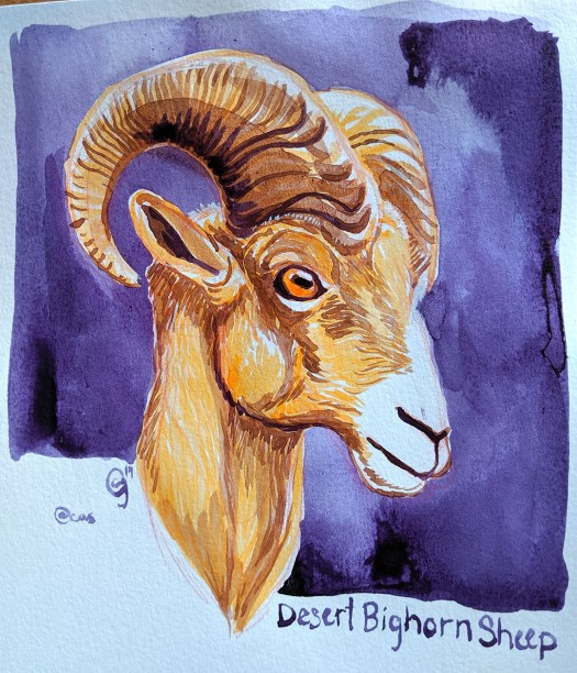 About Them: Bighorn Sheep live across the western portion of North America from Canada to Mexico. Originally there were between 1.5 and 2 million and now there around between 60-50,000 in total, across all of their range. The males have large curling horns that they use for dominance displays to win rights to mate with females. Males over 2 years olds move in bachelor groups while females and younger sheep live separately. The Bighorn really rely on traveling through territories moving from higher elevations in spring and summer to lower elevations in winter for differing food sources and to have males and females meet for procreation.